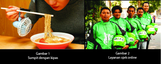 Kedua gambar di atas, sama-sama menawarkan solusi bagi konsumennya. Namun, bila kita melihat dari segi kepentingannya, produk sumpit dengan kipas belum dianggap menjadi kebutuhan yang penting untuk dimiliki. Hal ini berati, produk tersebut termasuk dalam kategori solusi yang nice to have. Bandingkan dengan layanan ojek online yang saat ini tengah menjamur di masyarakat. Sepertinya sudah tak asing lagi jasa tersebut wara-wiri di jalan, terlebih lagi saat jam kantor yang cenderung macet. Dalam hal ini, ojek online terbilang masuk dalam kategori solusi must have.