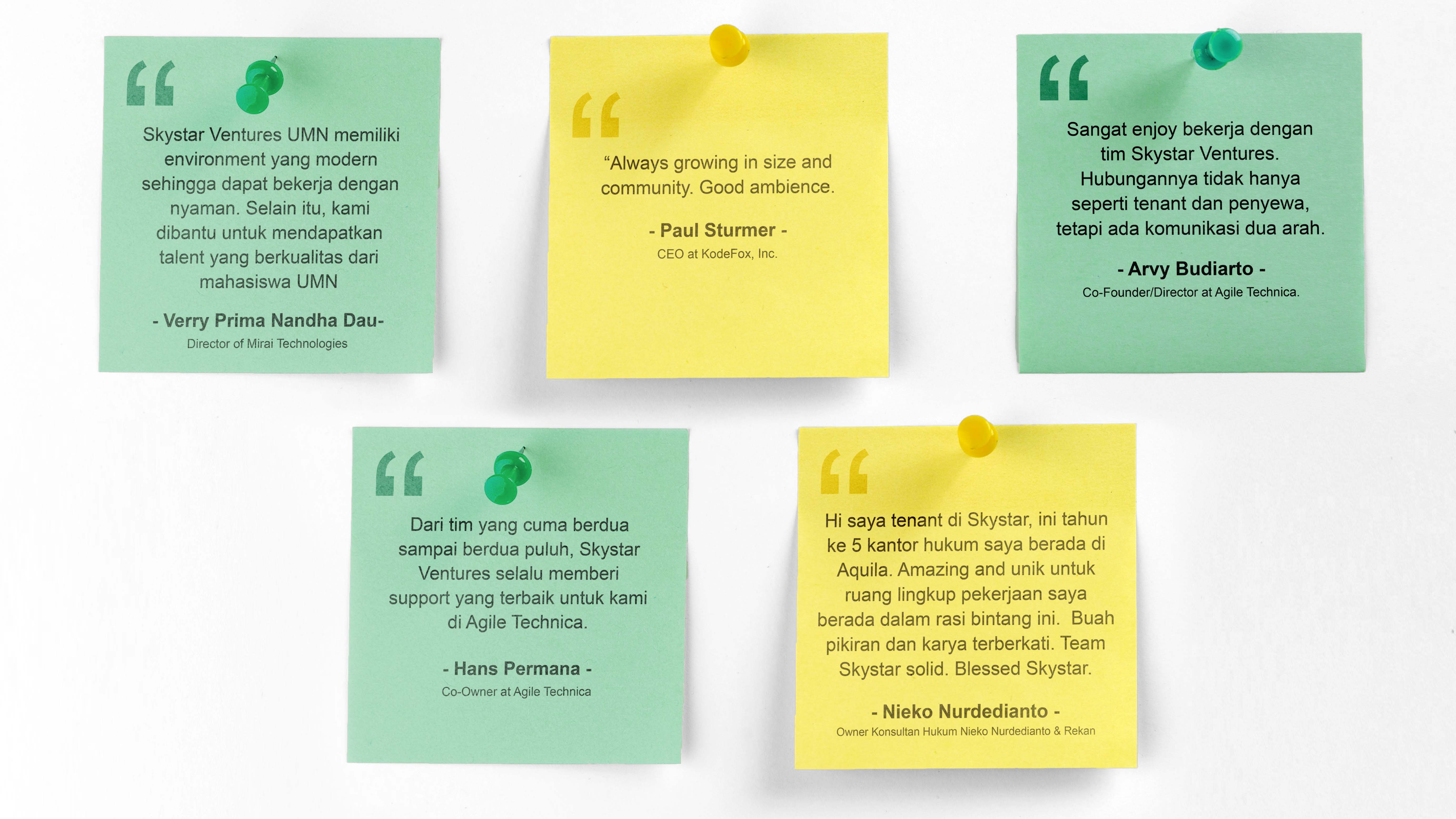 Berikut ada beberapa kesan dari tenant yang telah memilih coworking space Skystar Ventures UMN sebagai tempat mereka bekerja.