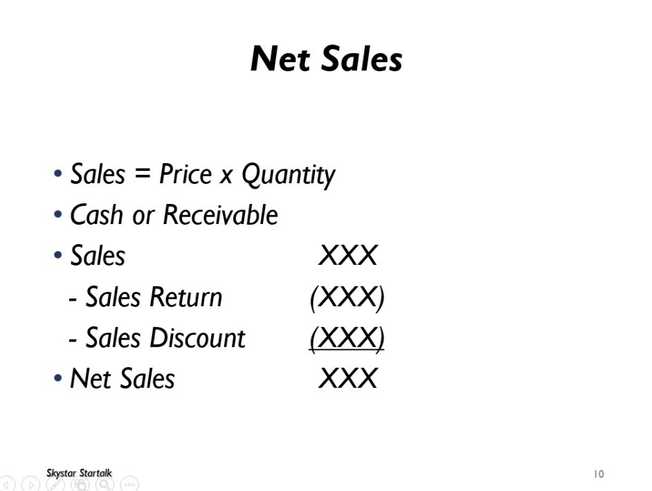 Net sales merupakan penjualan bersih mengacu pada total pendapatan penjualan perusahaan dalam periode tertentu setelah dikurangi  tunjangan untuk barang yang hilang atau rusak, pengembalian, dan diskon penjualan. Dengan kata lain, penjualan bersih adalah sisa hasil penjualan setelah semua pengembalian, diskon, dan tunjangan dihapus dari jumlah kotor.