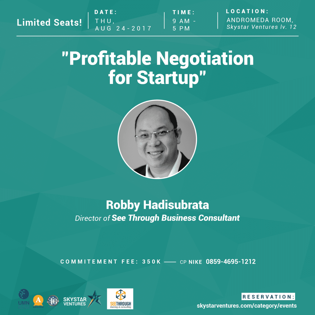 Practical Workshop : Profitable Negotiation for Startup Bagi startup, deal closing itu mudah. Tapi, apakah kesepakatan yang dihasilkan sudah sesuai dengan…