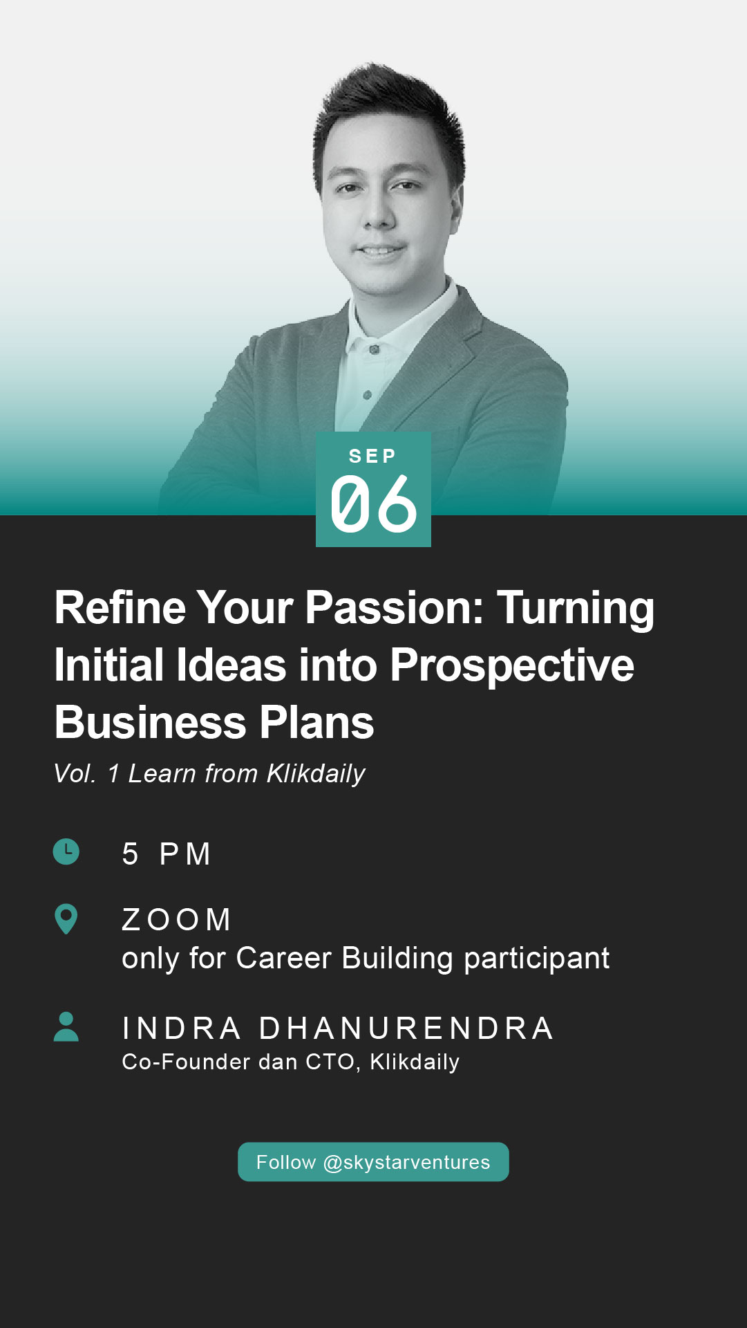 Untuk kamu yang memiliki passion membangun bisnis berbasis teknologi, ikuti sesi Career Building (CDC x Skystar Ventures) “Refine Your Passion: Turning Initial Ideas into Prospective Business Plans” Vol.1 #LearnFromKlikdaily bersama Indra Dhanurendra – Co-Founder dan CTO dari Klikdaily!