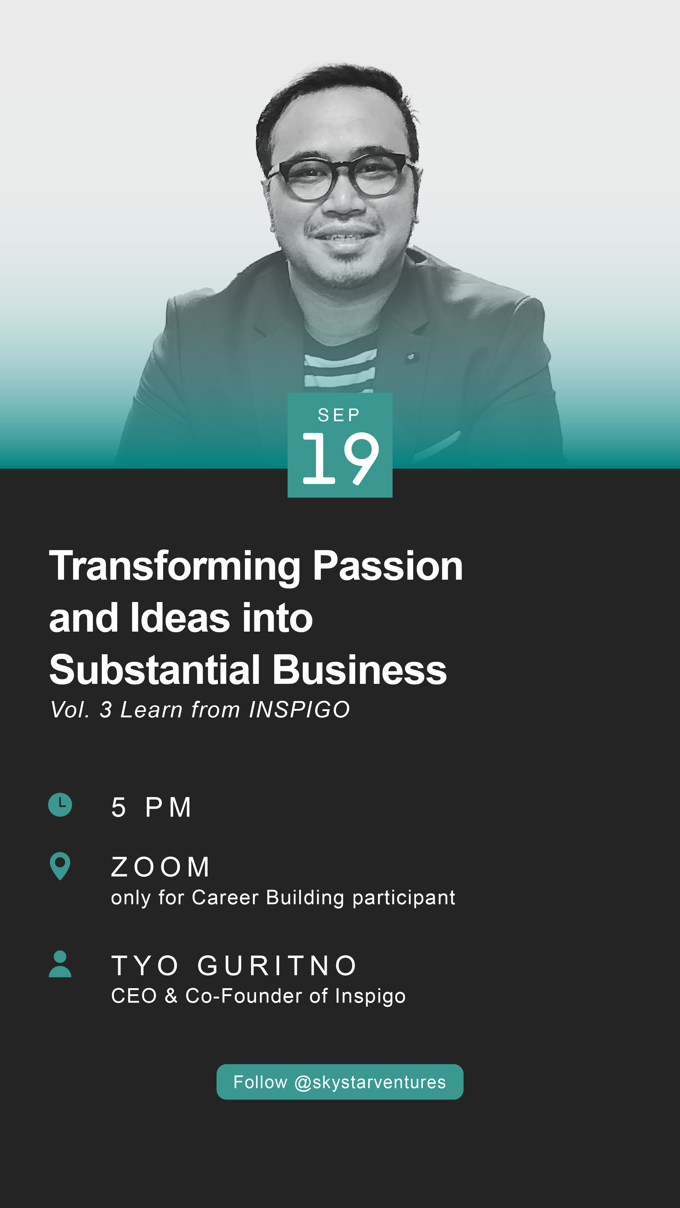 Untuk kamu yang memiliki passion di bidang komunikasi, ikuti sesi Career Building (CDC x Skystar Ventures) “Transforming Passion and Ideas into Substantial Business” Vol.3 #LearnFromInspigo bersama Tyo Guritno – CEO & Co-Founder dari Inspigo!