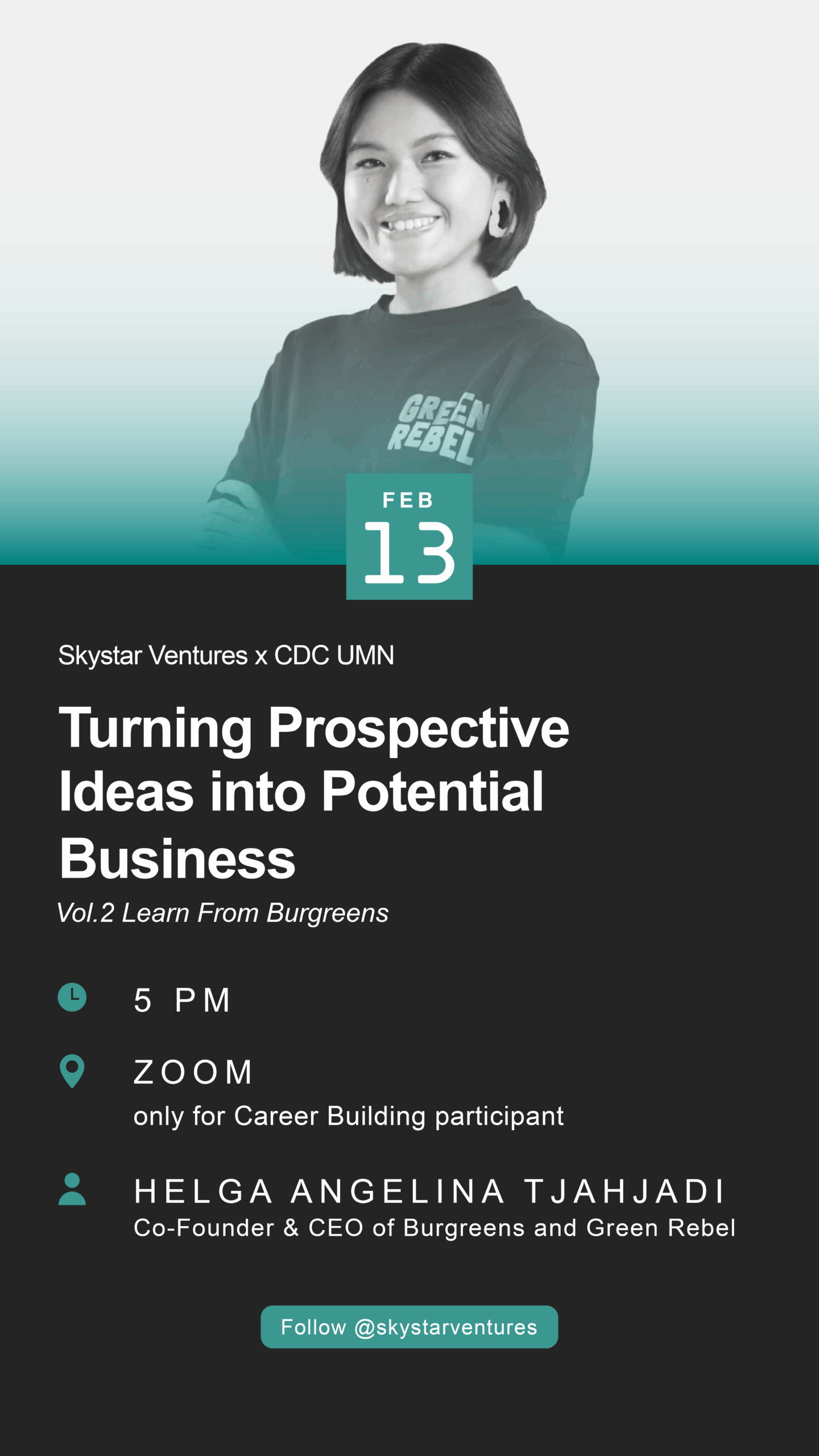 Untuk kamu yang memiliki passion membangun dan mengolah bisnis, ikuti sesi Career Building (CDC x Skystar Ventures) “Turning Prospective Ideas into Potential Business” Vol.2 #LearnFromBurgreens bersama Helga Angelina Tjahjadi – Co-Founder & CEO dari Burgreens and Green Rebel!