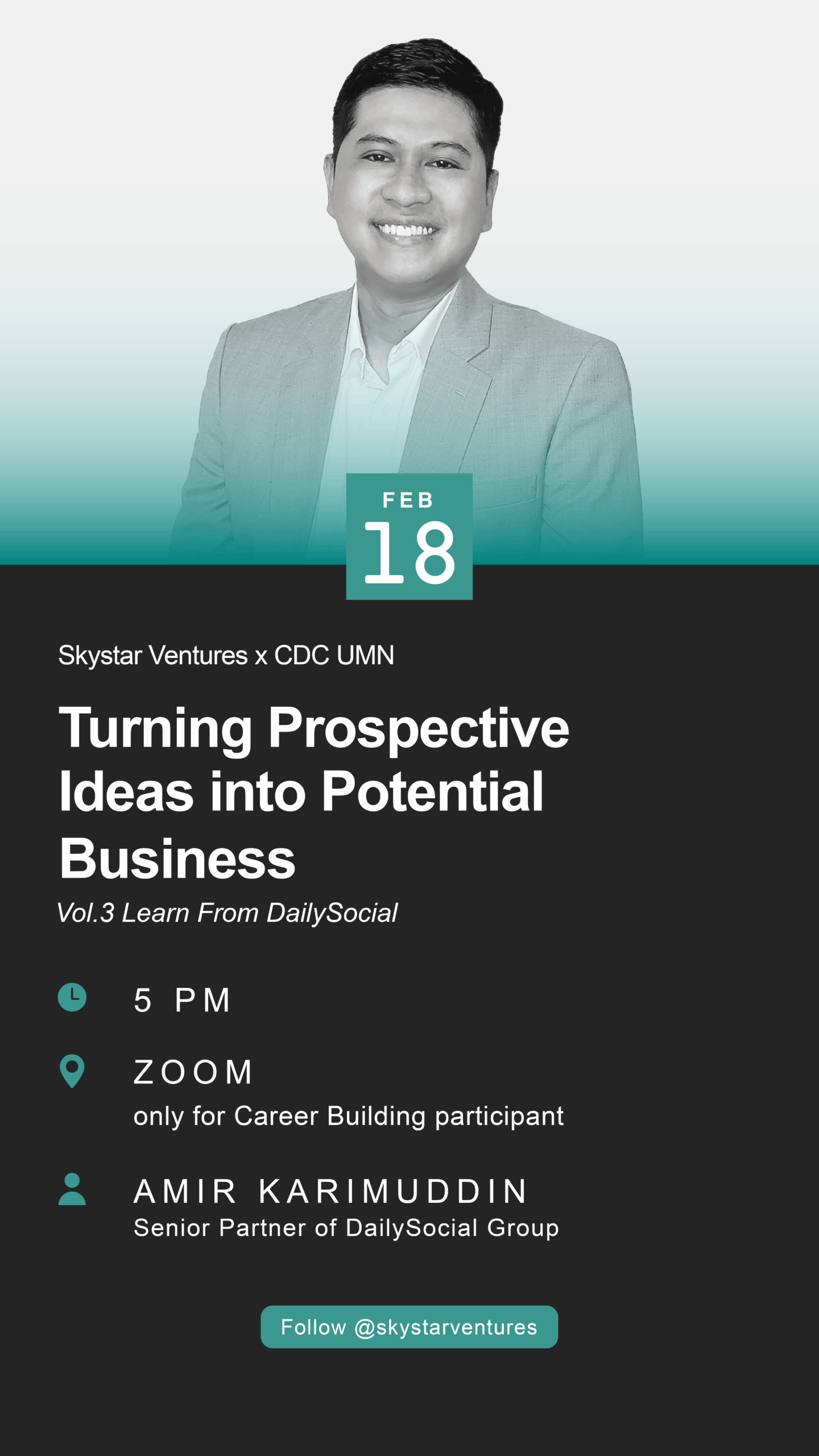 Untuk kamu yang memiliki passion di bidang komunikasi, ikuti sesi Career Building (CDC x Skystar Ventures) “Turning Prospective Ideas into Potential Business” Vol.3 #LearnFromDailySocial bersama Amir Karimuddin – Senior Partner dari DailySocial Group!