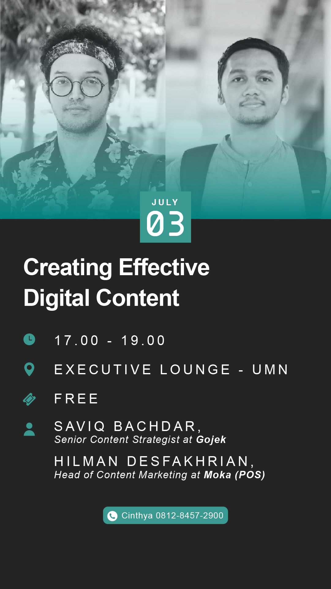 Ikuti Mini Workshop bersama Skystar Ventures dengan tema “Creating Effective Digital Content” bersama dengan Hilman Desfakhrian – Head of Content Marketing at Moka (POS) & Saviq Bachdar – Senior Content Strategist at Gojek.