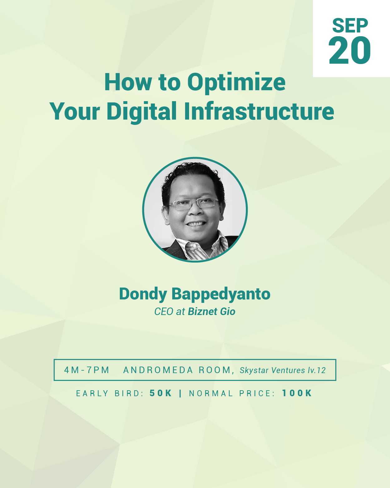 Oleh karena itu kali ini Skystar Ventures mengundang praktisi cloud infrastructure yang sudah memiliki pengalaman bertahun-tahun di bidang ini. Cari tahu lebih dalam tentang optimalisasi cloud infrastructure bersama Dondy Bappendyanto – CEO Biznet Gio!
