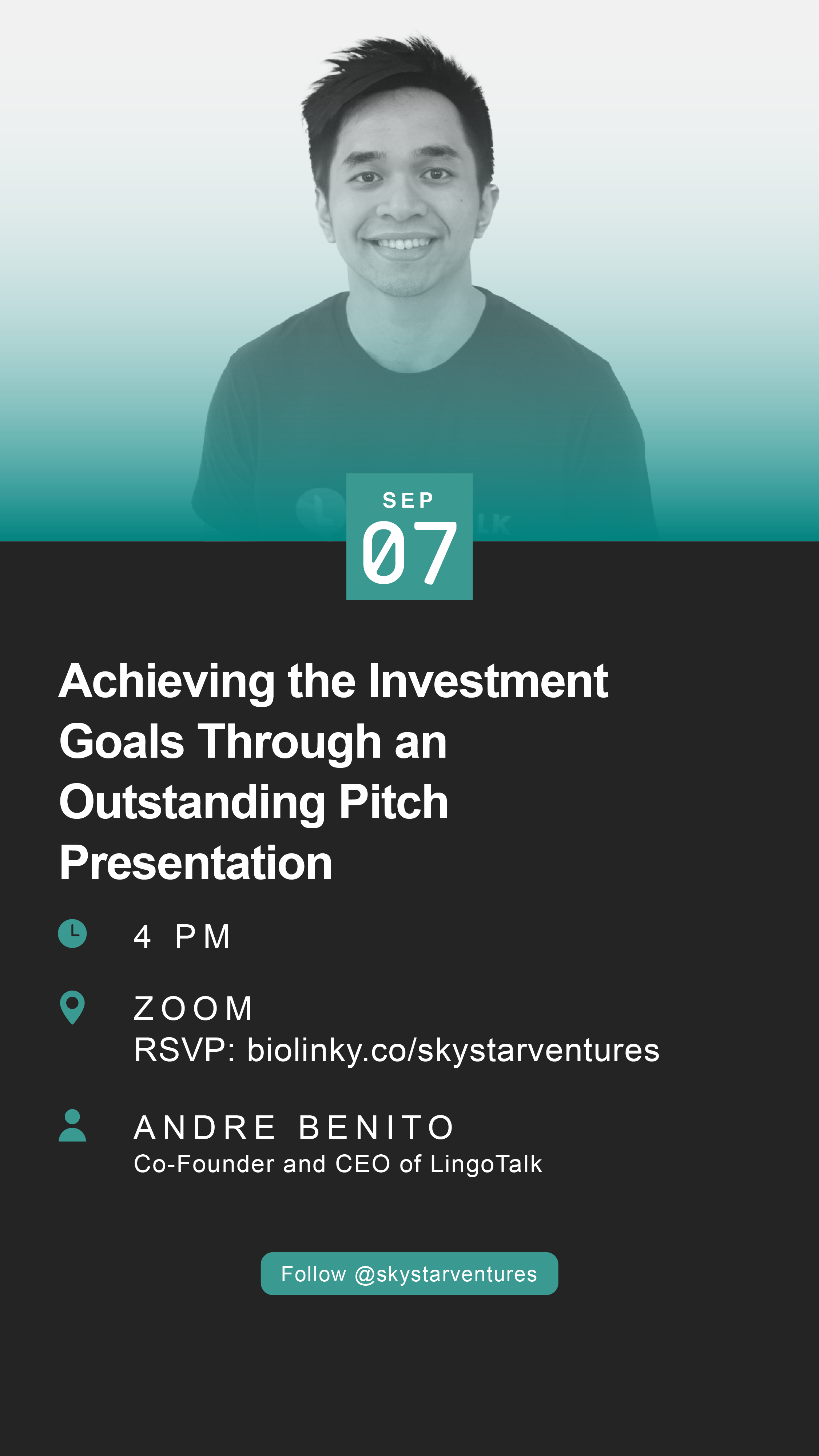 Ayo bergabung dan pelajari prosesnya disesi terakhir STARTALK Startup Development Series “Achieving the Investment Goals Through an Outstanding Pitch Presentation” bersama Andre Benito – Co-Founder and CEO of LingoTalk!