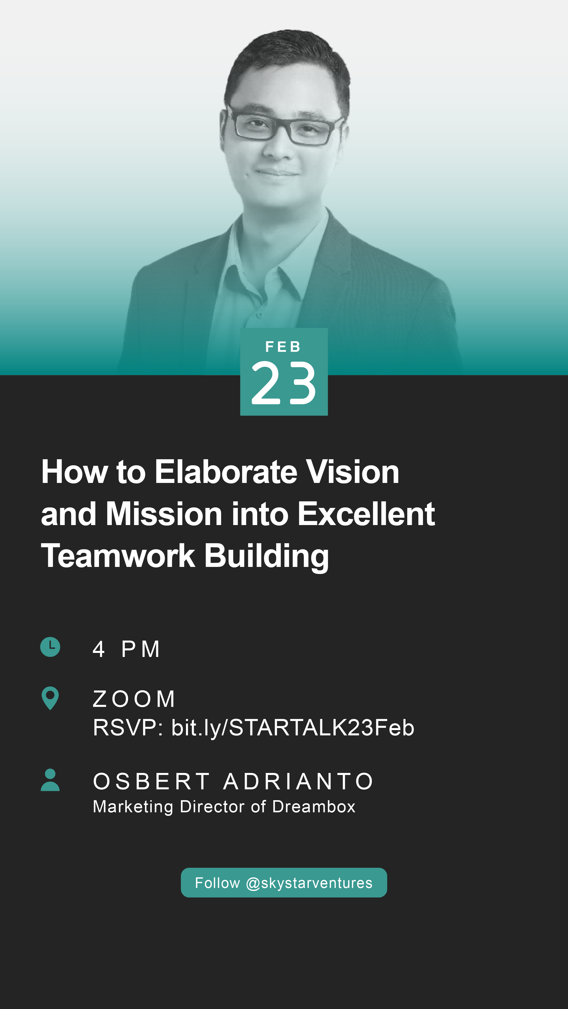 Ayo temukan dan pelajari bersama-sama disesi STARTALK “How to Elaborate Vision and Mission into Excellent Teamwork Building” bersama Osbert Adrianto – Marketing Director dari Dreambox!