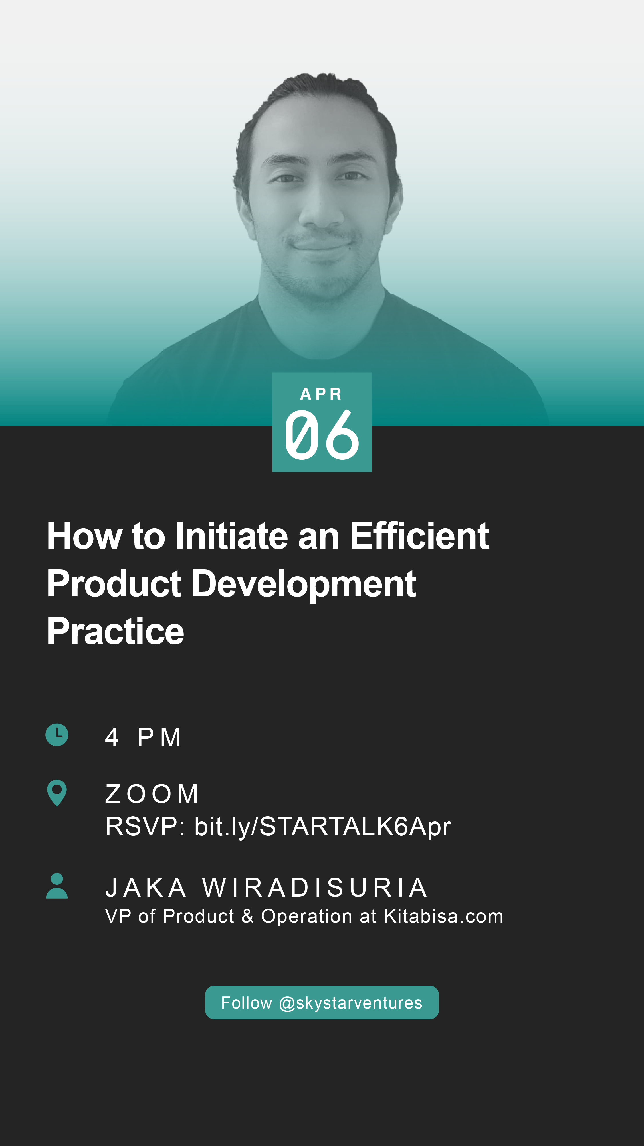 Ayo bergabung dan pelajari secara langsung metode serta cara dalam melakukan Product Development disesi STARTALK Series: Startup Development “How to Initiate an Efficient Product Development Practice” bersama Jaka Wiradisuria – Vice President of Product and Operation at Kitabisa.com!
