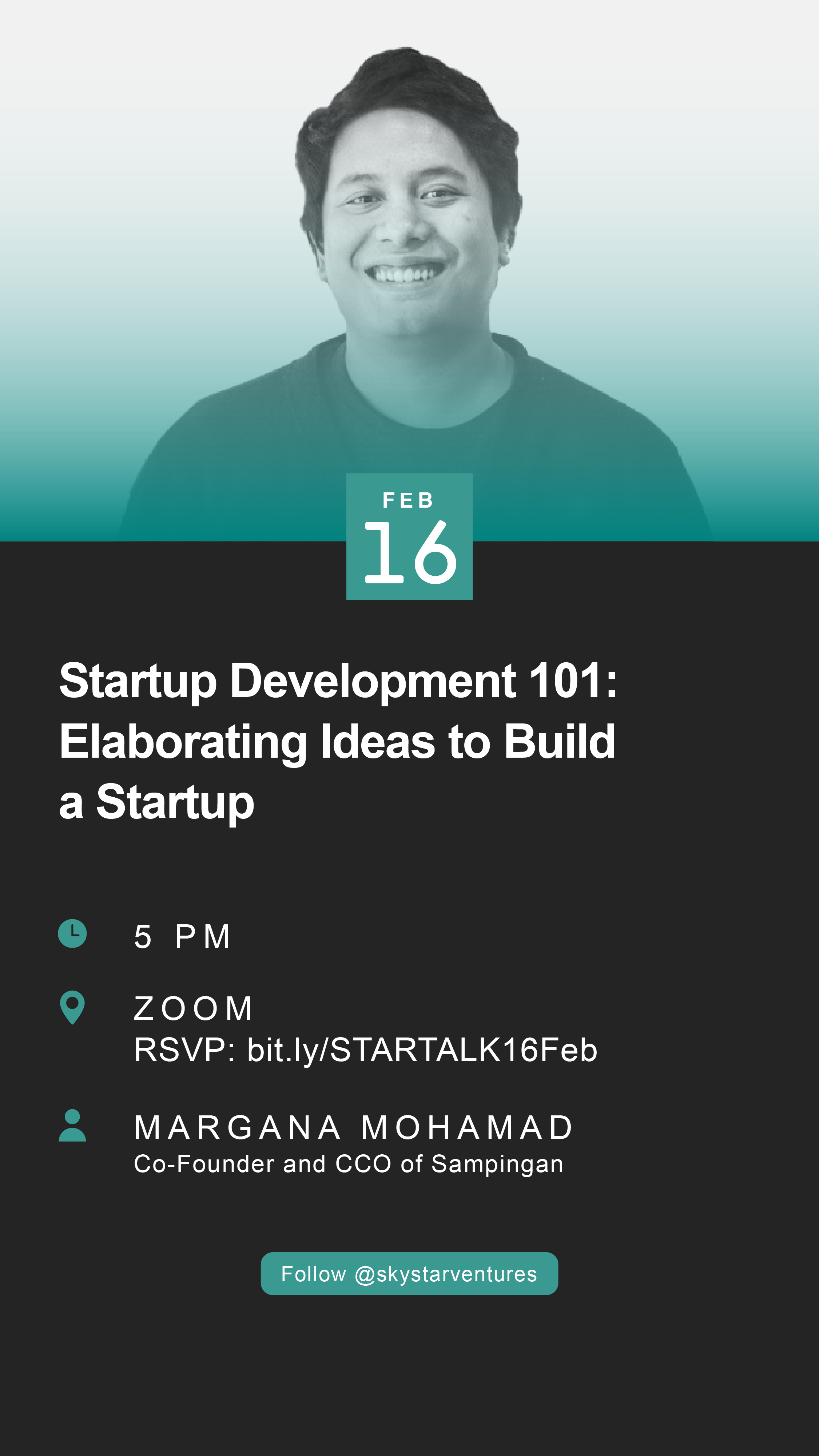 Ayo pelajari secara langsung proses formasi ide dan pengembangannya, untuk membangun startup yang potensial, dengan mengikuti sesi STARTALK “Startup Development 101: Elaborating Ideas to Build a Startup” bersama Margana Mohamad – CCO dan Co-Founder dari Sampingan!