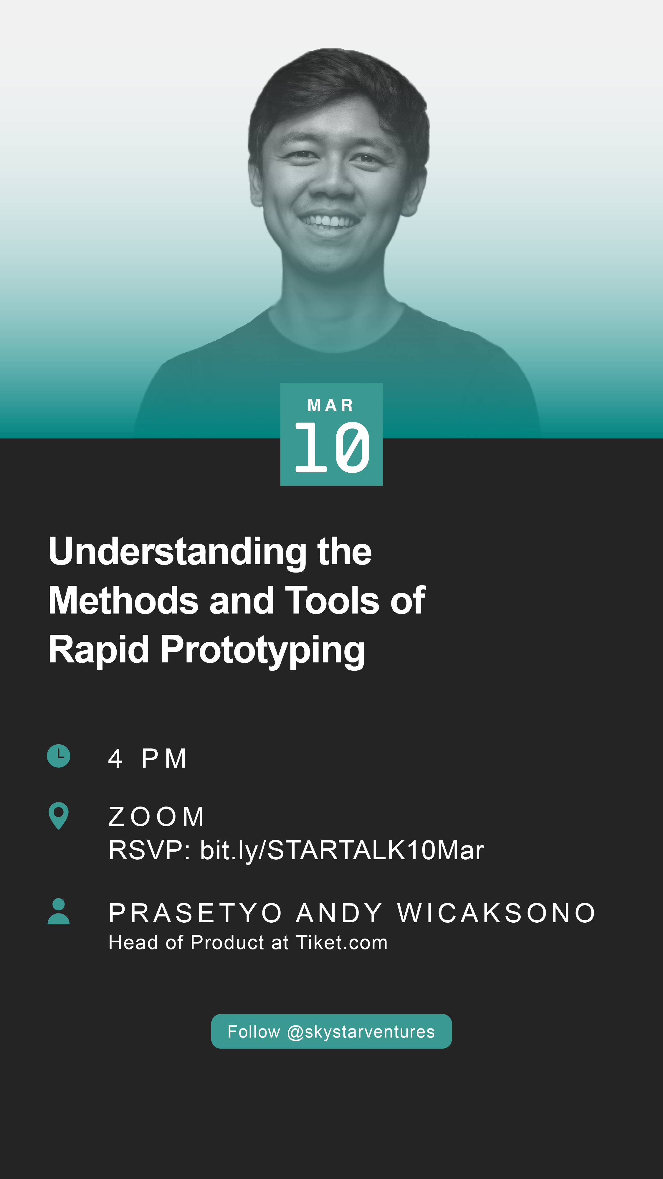 Ayo bergabung dan pelajari secara langsung metode serta cara dalam melakukan Rapid Prototyping disesi STARTALK Series: Startup Development “Understanding the Methods and Tools of Rapid Prototyping” bersama Prasetyo Andy Wicaksono – Head of Product di Tiket.com!