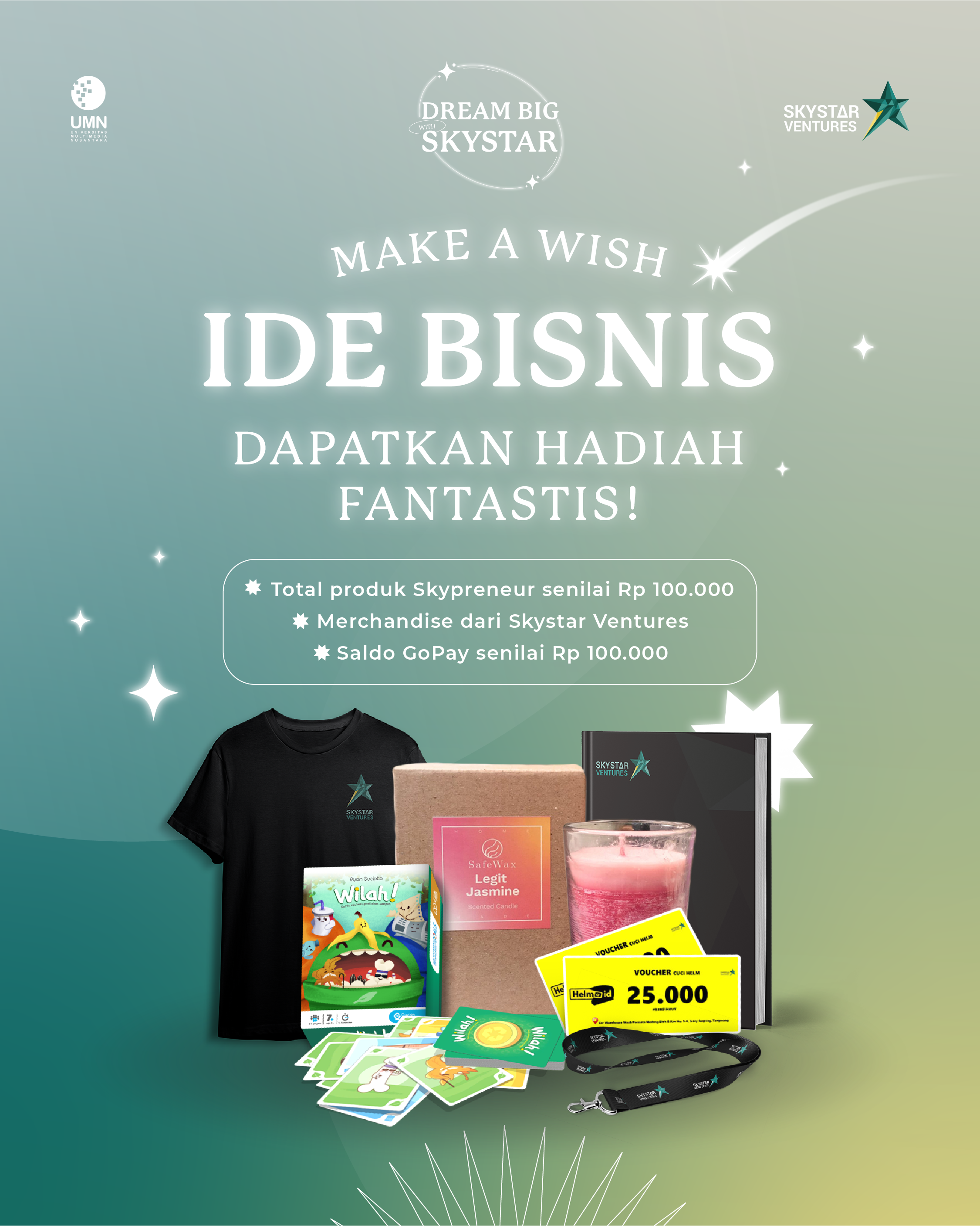 Sekarang, kamu bisa menuangkan ide tersebut dalam giveaway Skystar Ventures UMN, lho. Dengan mengusung tema #DreamBigWithSkystar, Skystar Ventures mau mengajak kamu untuk mengeksplorasi ide-ide solutif yang bisa diaplikasikan menjadi sebuah startup. Kamu cukup comment ide startup impian kamu di Instagram @skystarventuresprogram dan ide paling menarik bisa mendapatkan beberapa produk keren dari peserta inkubasi bisnis Skystar Ventures dan saldo e-wallet. Yuk langsung lihat informasi lengkapnya di Instagram @skystarventuresprogram.